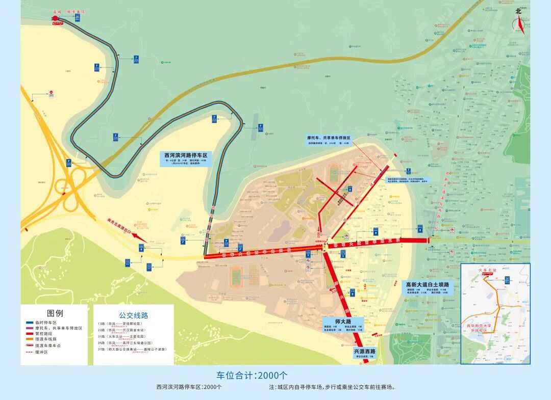3.西华师范大学校园不对外停车,有驾车观赛需求的观众,车辆可以在赛场周边的体育公园停车场、新豪天地停车场、不夜城停车场、永辉超市停车场等停放车辆,西河滨河路(西华路四段路口至蓝城桃李春风小区段)双向单排有序停放。