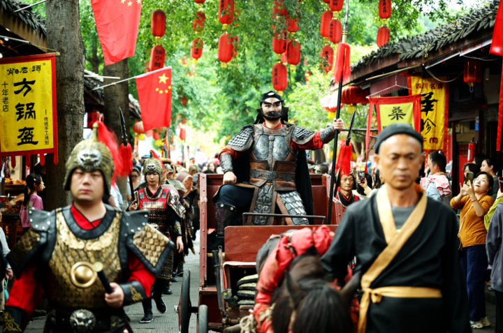 阆中古城更是化身为大型沉浸式演艺舞台,以“文化IP活化”“时代热点联动”为核心,为游客呈现一场传统与现代对话的文旅盛宴。经典三国IP焕发新生,“张飞点兵+巡游”节目每日在澄清门及古城街道上演,游客可前往张飞庙广场参与“拜见将军”沉浸式情景剧,穿上戏服与“张飞”互动对戏,体验“英雄招募”,深度体验三国文化魅力。“状元巡游”活动特邀KOL身着华服,在古城街巷与游客互动合影,参与NPC互动游戏即有机会兑换月饼、文创等节日小礼品。各大常设演艺同样精彩纷呈,《阆苑传奇》《客来阆中》《春节盛世》3项演艺活动轮番登场,“相和歌”鼓舞、街头杂耍、月下鱼灯会等街头表演遍布古城街巷,让游客步步有戏,全程沉浸于阆苑独特的文化氛围之中。