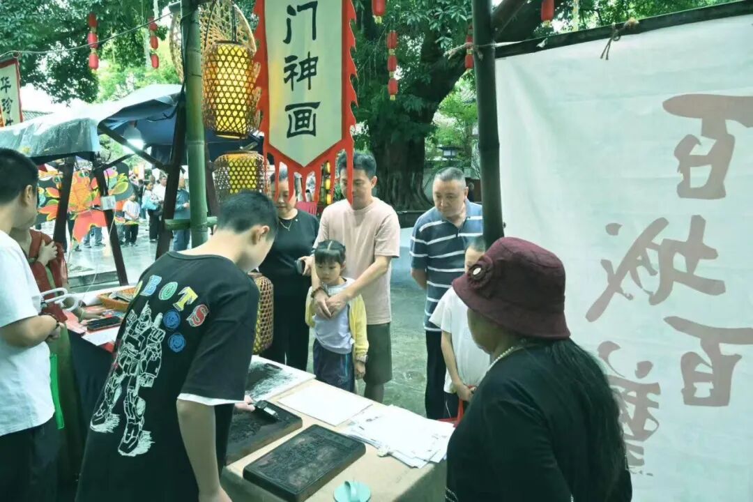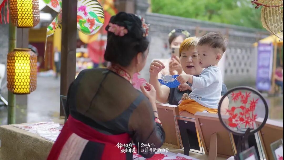 在剪纸摊位前,不少家长带着孩子在此驻足,孩子们近距离观赏剪纸艺人的精湛技艺,感受指尖上的非遗乐趣。