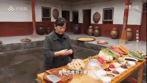 不同的蔬菜有不同的泡制方法,这些在淡盐沸水中预煮过的蔬菜洗净晾干等待入坛。雷凤仙今天要制作够全家吃几个月的泡菜,第一坛是泡子姜,清洗干净的子姜掰成小块放入坛中,依次加入葱段、花椒、小米辣、八角、香叶、冰糖,再撒上适量的食盐,加入白酒,放凉的白开水淹没子姜。泡菜是湿性发酵,炮制时间短则一夜,长的也只需两三天,四川人俗称洗澡泡菜,密封、扣碗,坛口四周装水,剩下的就交给时间去转化。每家泡菜的制作手法都不尽相同,配料的稍许变化,时机的细微差别,腌制出来的泡菜口味则千差万别。