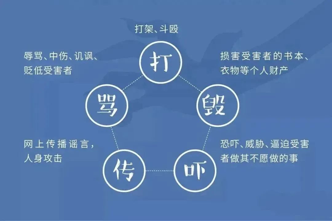 3. 社交欺凌:恶意排斥、恐吓、威胁、逼迫、孤立他人,影响他人参加学校活动或者社会交往。