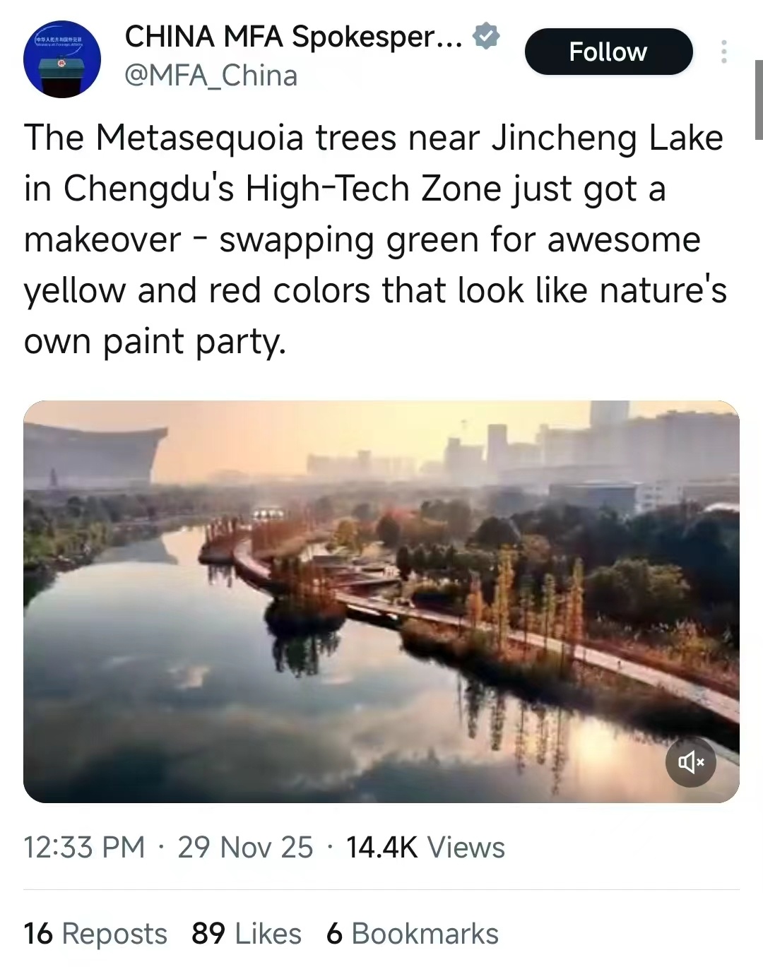 时间倒回上个月,外交部账号直接“晒”出锦城湖的初冬大片。候鸟、彩林、蜿蜒的骑行道,简直就是“车行碧波上,人在画中骑”。