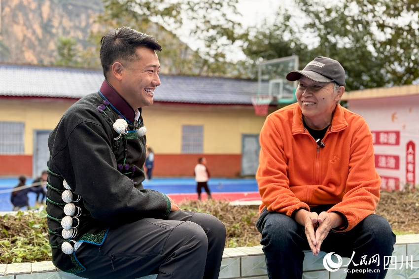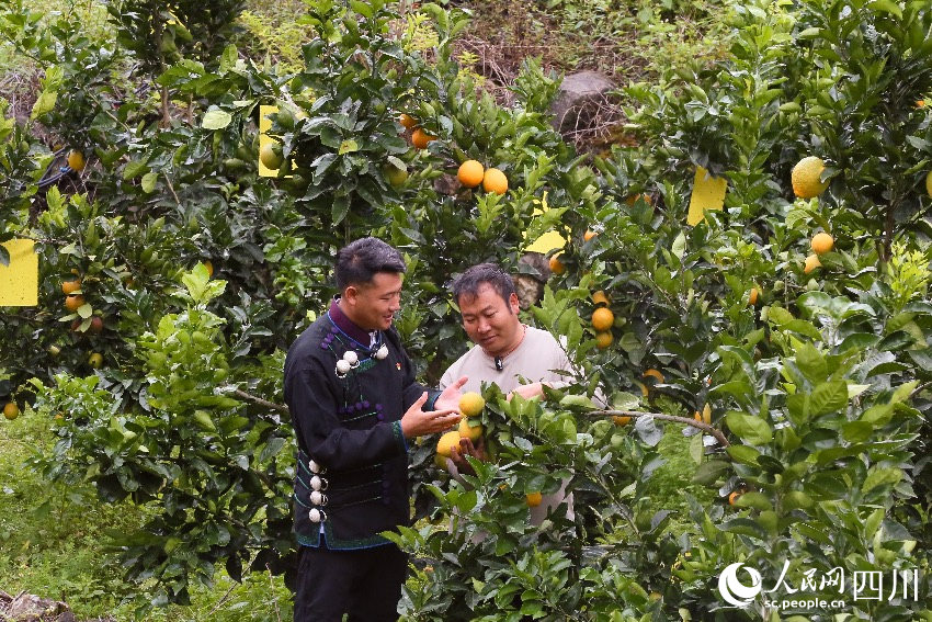 吉列子日与村民陈日子黑在果园沟通管护细节。人民网记者 朱虹摄