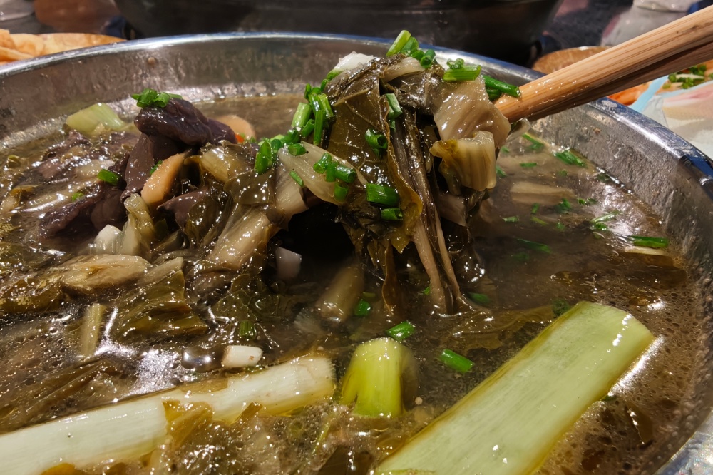 在鸡鸣三省交界处,云南镇雄德隆村、贵州毕节七星关区林口镇和水潦这三地的人都爱吃酸菜小豆汤,唯一区别是水潦村民更喜欢“素酸菜”,就是汤里面不沾半点油气。安定群说,自己做酸菜的食材不太讲究,首选青菜,长筒白菜、小白菜也可以。在沸水中煮两三分钟后捞出放入陶缸里,加入老酸菜的“酸本”,用塑料膜盖好压上石头,温暖气候下,第二天即可煮汤食用,冬季最长可放一周左右。腌好的酸菜和煮得软糯的豆子煮汤,豆子和菜泾渭分明却味觉相融。准确说来,与四川泡酸菜不同,酸菜小豆汤其实只能算“微酸”,嚼起来味道甚至还有些菜的生味,但大家却爱极了这种口感,用来泡饭算得上一绝,餐餐必上桌。