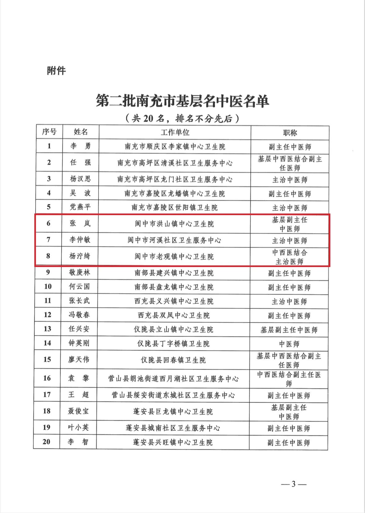 12月15日,南充市中医药管理局印发《关于公布第二批南充市基层名中医名单的通知》,经基层推荐、县级初评公示、市级审核、专家评审和综合评价等程序,我市洪山镇中心卫生院张岚、河溪社区卫生服务中心李仲敏、老观镇中心卫生院杨泞绮入选第二批南充市基层名中医。
