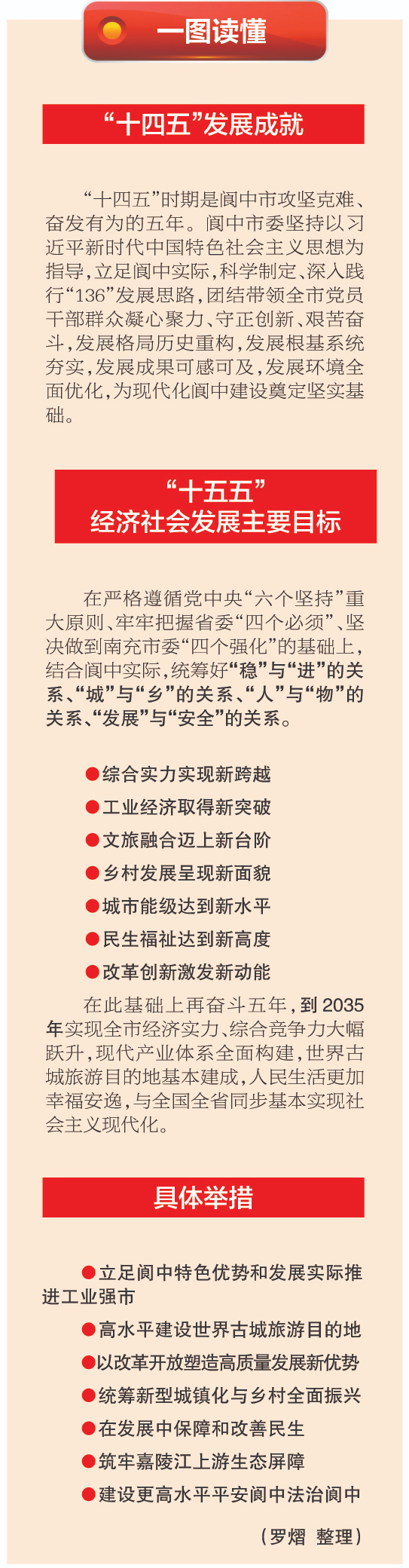 2025年12月31日,中共阆中市委十四届十次全会暨经济工作会议召开。会议听取并讨论了阆中市委书记杨德宇代表市委常委会所作的工作报告,审议通过了《中共阆中市委关于制定阆中市国民经济和社会发展第十五个五年规划的建议》,为阆中未来五年的发展明确路径。