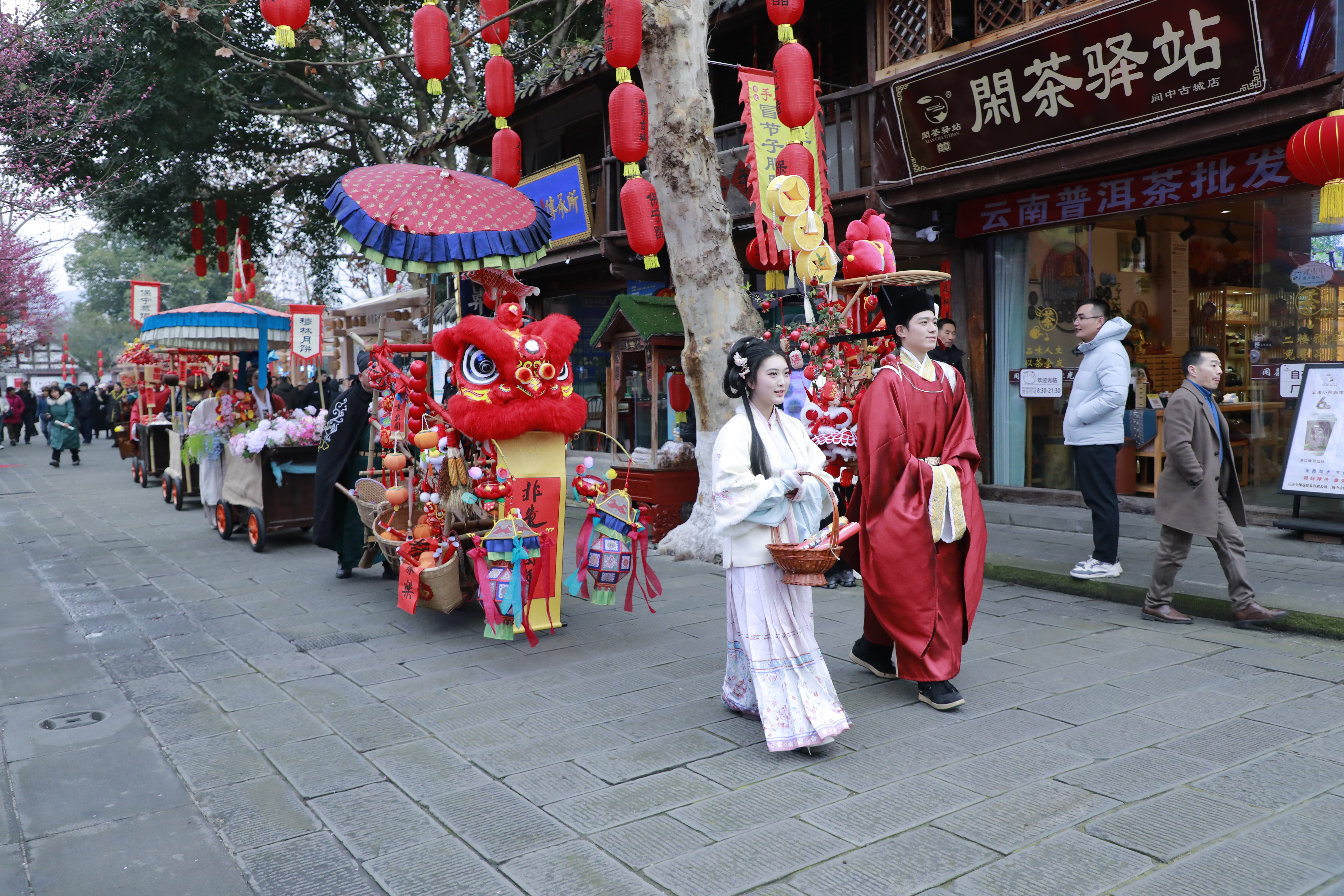 在优学园广场,来自四川各地的 15 项非遗集中呈现。川北凉粉、保宁醋、张飞牛肉等特色美食令人垂涎;西充泥塑、仪陇剪纸、嘉陵扎染等手工艺品精巧绝伦。传承人现场展示技艺,游客不仅能品尝购买,更能亲手体验制作,感受指尖上的非遗温度。优学园舞台上,川北大木偶气势恢宏,川北灯戏灵动俏皮,铿锵有力的巴象鼓舞更是将现场氛围推向高潮。传统艺术与现代舞台相得益彰,赢得了观众阵阵掌声。此外,身着汉服的工作人员漫步于青石板巷间,与古城景致相映成趣,重现了古代市井的生动图景,吸引众多游客驻足互动、拍照打卡。