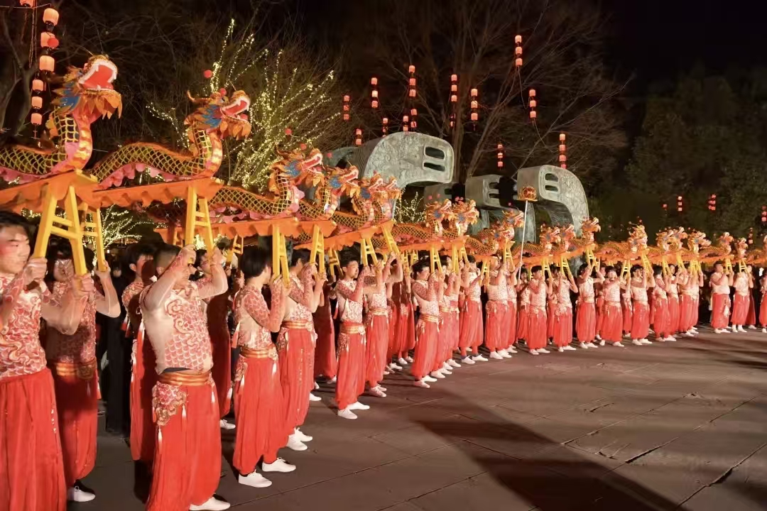 在贡院广场,两人一组的表演者用板凳组成龙身,近百人的队伍形成了百米长龙。舞龙队伍在广场上摆出各种造型,时而翻飞腾跃,时而蜿蜒游走,穿腾、左右翻身、翻江倒海,非遗的艺术魅力感染着所有的观众。
