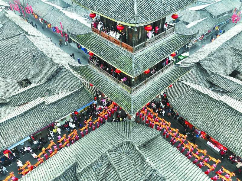 古城街巷里,《巴象鼓舞》鼓声震天,川剧变脸精彩连连,鱼灯、板凳龙、采莲船、十二生肖偶等当地民俗节目组成的巡游队伍穿梭于古城街巷中,将节日气氛推向高潮。