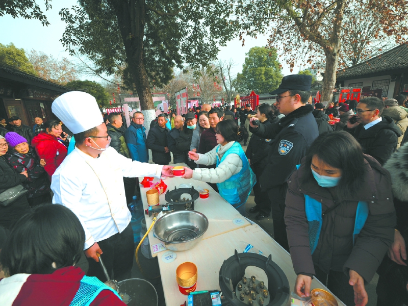 上午10时,精心熬制的腊八粥出锅。在张飞广场,一碗碗热腾腾、香喷喷的腊八粥端上桌,市民游客聚在一起,品着美味的腊八粥,参与主办方组织的小游戏,热情高涨、兴致盎然。