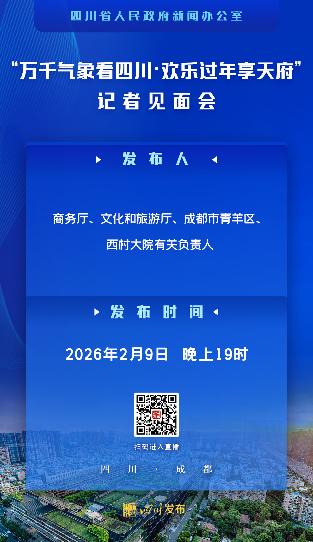 2026年2月9日(星期一)19:00,省政府新闻办将在西村大院举行“万千气象看四川·欢乐过年享天府”记者见面会,请商务厅、文化和旅游厅、成都市青羊区、西村大院有关负责人与记者见面交流。四川发布客户端将全程图文直播,敬请关注!