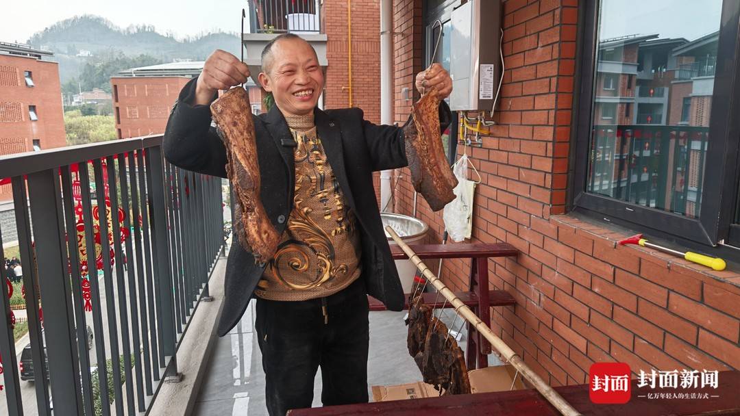 正午的阳光晒得阳台暖洋洋,村民向彩奎正蹲在客厅里,仔细整理着一排排熏好的腊肉。“孩子们都要回来过年,早早就把年货备足了!”一块块油亮的腊肉,是寻常人家最朴实的年味,也是灾后生活重回正轨最生动的注脚——家安了,年近了,日子的烟火气,终于又稳稳地回来了。