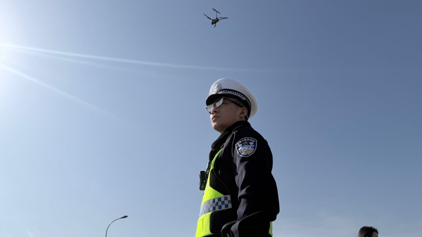 在熊猫基地景区外停车场 警务无人机配合佩戴AI智能眼镜的交警执勤