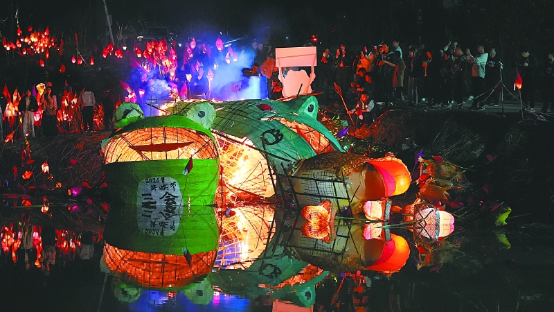 当一支支队伍行至河边,巡游也渐渐进入尾声。大家按照传统习俗,将大蛴蟆灯扔进河中,将手中小蛴蟆灯插入土中焚烧。随后,震耳欲聋的鞭炮声再次响起,仿佛在为“蛴蟆”们送行,也为人们即将开启的美好生活奏响序曲。