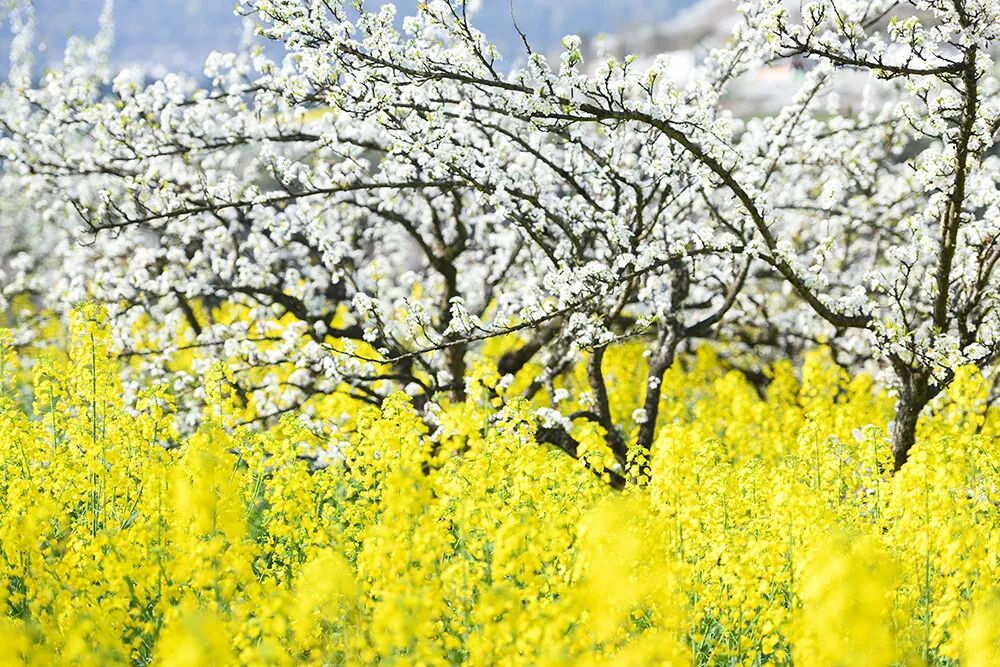 油菜花开了。一开,便是铺天盖地的金黄,漫过田垄,涌向天际,仿佛大地忽然揭开了灿烂的封面。最寻常的花,也是最让人心安的花——坡地上,平原里,只待一缕东风拂过,便倾尽颜色地开放。她们与青青麦苗低语,与雪白李花对视,远处那三两树粉红桃花,像是春天在画幅角落,悄悄落下的一枚闲章。