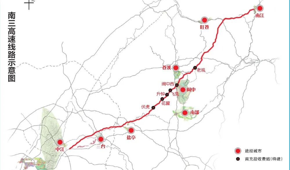按照规划,南三高速项目是今年四川省计划开工的里程最长、投资规模最大的重点项目,建设工期为3年。项目路线全长270.603公里,连接线长38.872公里,估算总投资约487.23亿元,途经巴中市(南江县)、广元市(旺苍县、苍溪县)、南充市(阆中市、南部县)、绵阳市(盐亭县、三台县)、德阳市(中江县)5个地级市内8个县(市)。路线起于南江县公山镇林家塝接G85银昆高速,终点位于中江县回龙镇南侧设置枢纽接S2成巴高速。南充段全长61.58公里,将在G75兰海高速(阆中枢纽)与兰海高速实现互通;南充段设置老观、阆中西、飞凤、升钟、花罐、伏虎6个收费站。