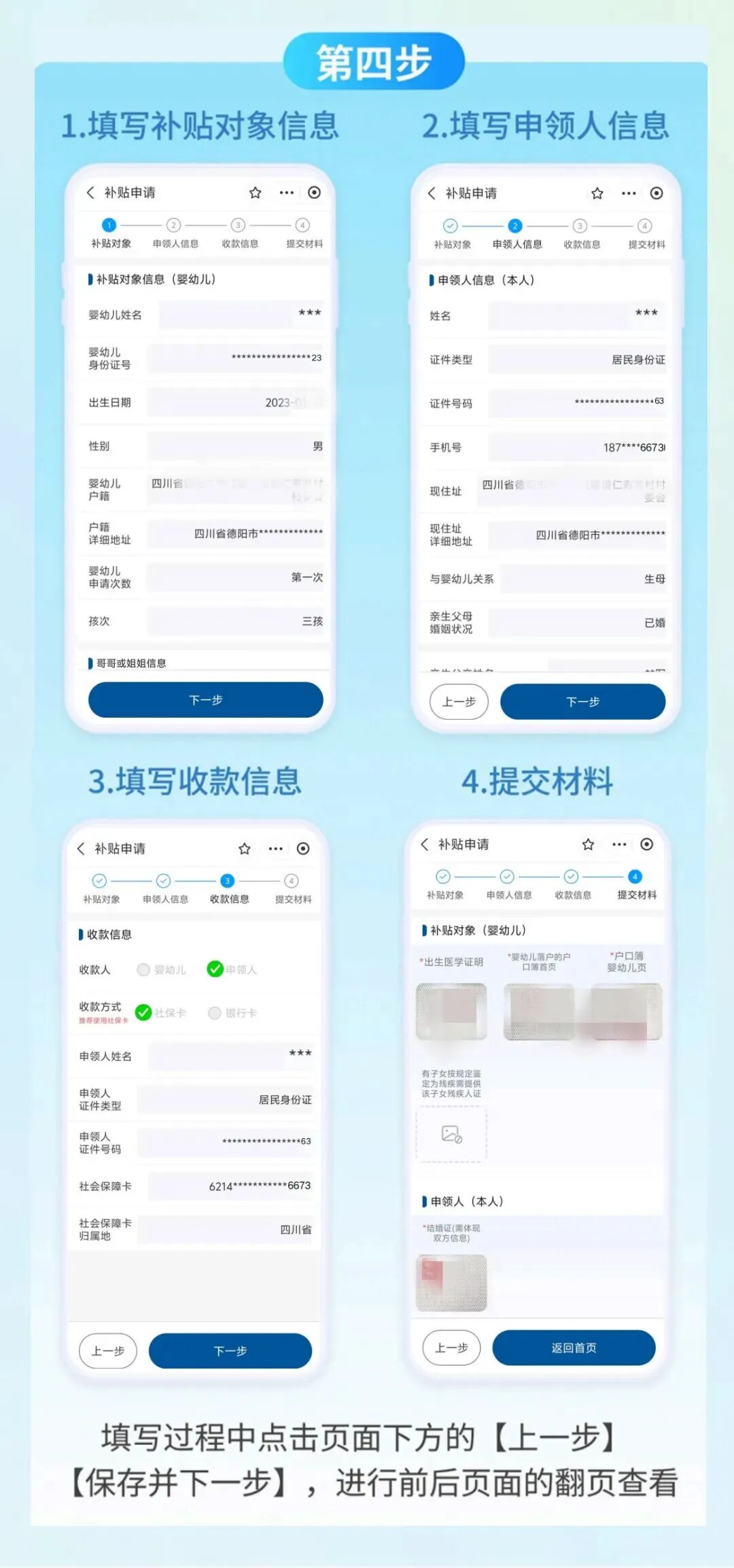 如果婴幼儿今年是第一次申请育儿补贴,可以提前准备好相关证件信息,如下图操作流程进行相关信息填写,提交成功后等待工作人员审核即可。