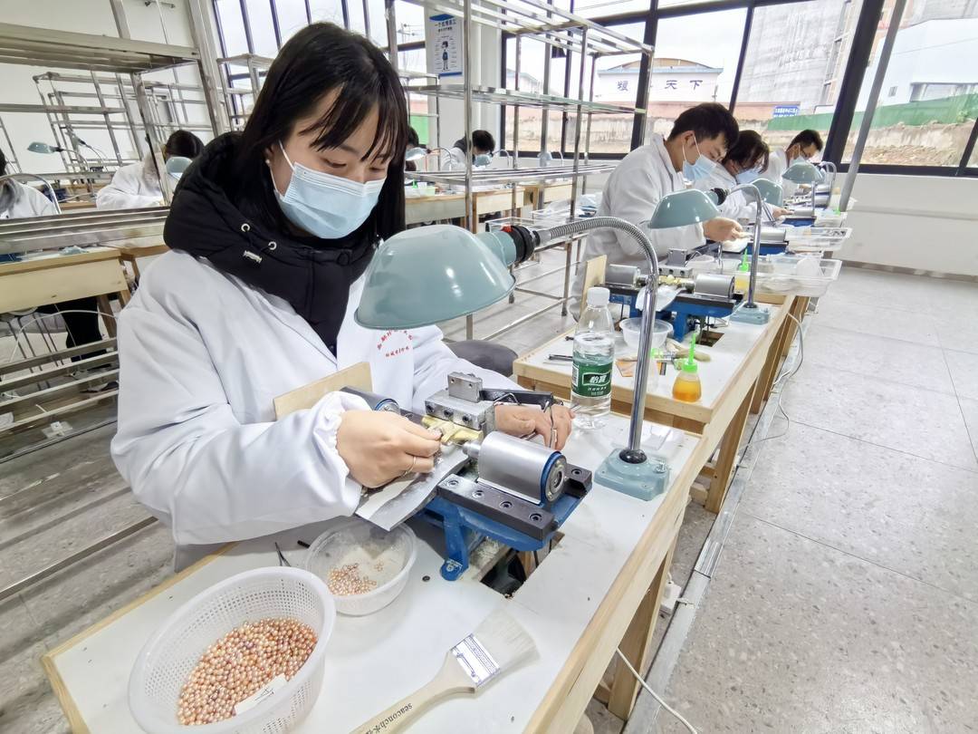 3月17日,在中国西部珍珠产业园内,工人们与机器高效配合着,对一颗颗珍珠进行分拣、打孔、串链等,然后流向市场,走向千家万户。