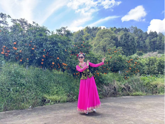 活动当天,果园里洋溢着欢声笑语。金灿灿的橙子挂满枝头,一派丰收景象。艺术团成员们身着绚丽多彩的民族服饰,在果园的空地上即兴跳起了欢快的新疆舞。旋转的裙摆、灵动的手腕、热情的笑容,瞬间点燃了现场气氛。悠扬的冬不拉旋律与果香交织,吸引了周边不少村民驻足观看,大家纷纷拿出手机记录下这“田园+歌舞”的精彩瞬间。