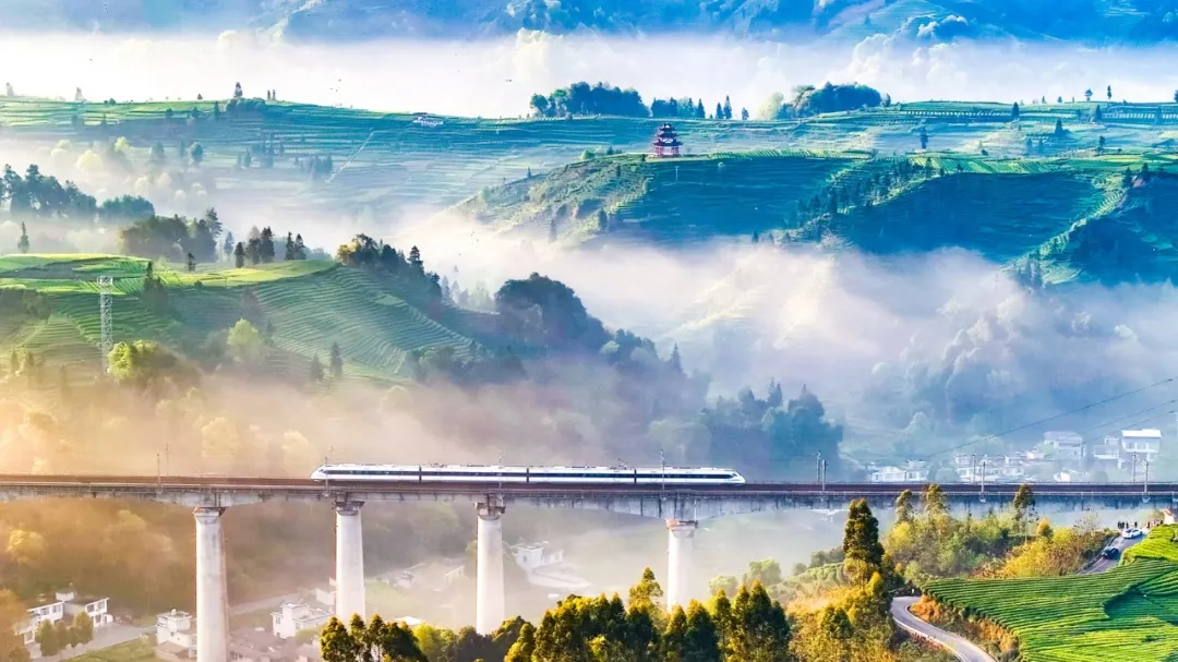 动车穿过雅安茶山,被网友称为现实版“千里江山图” 摄影/C视觉 黄刚