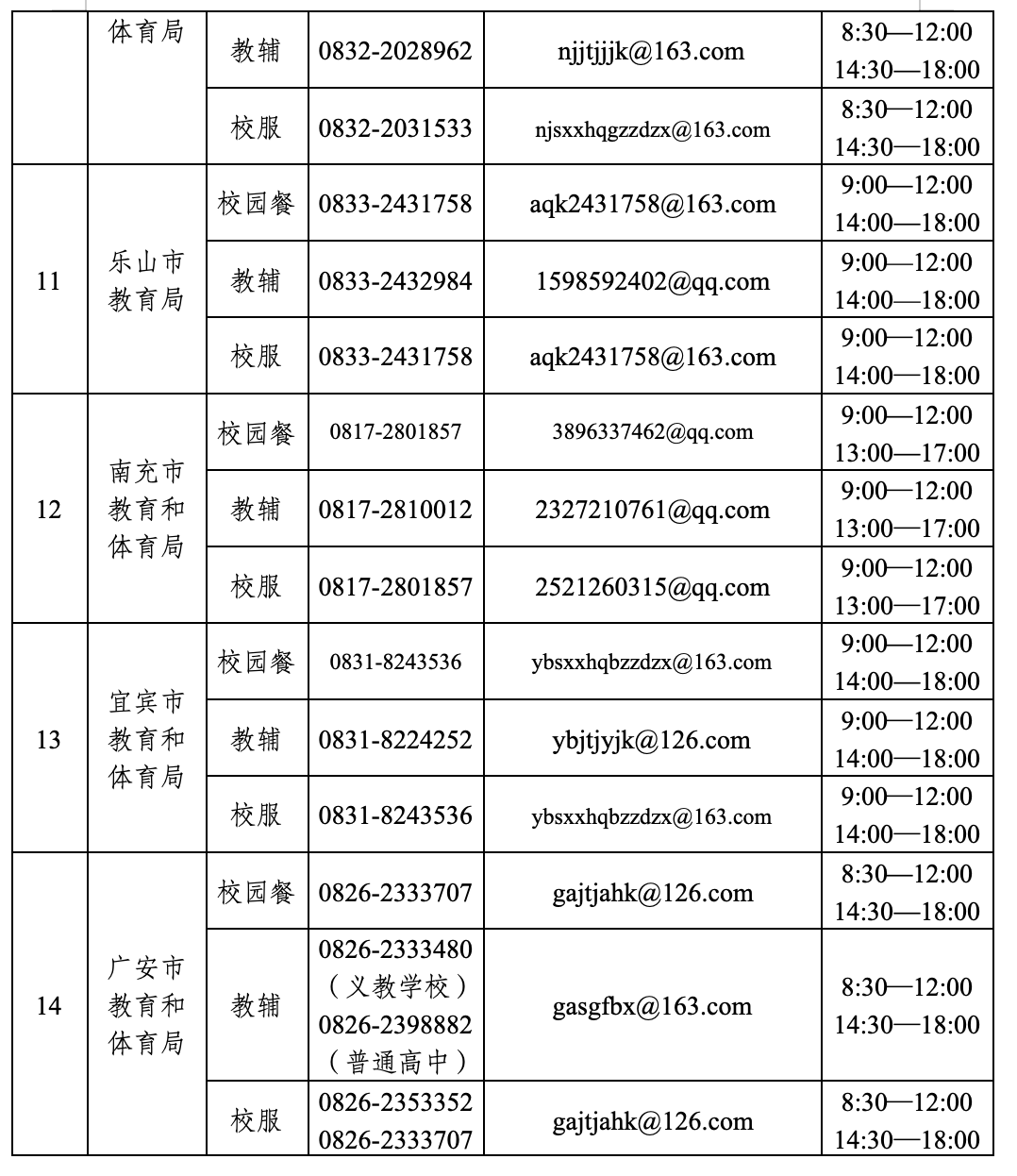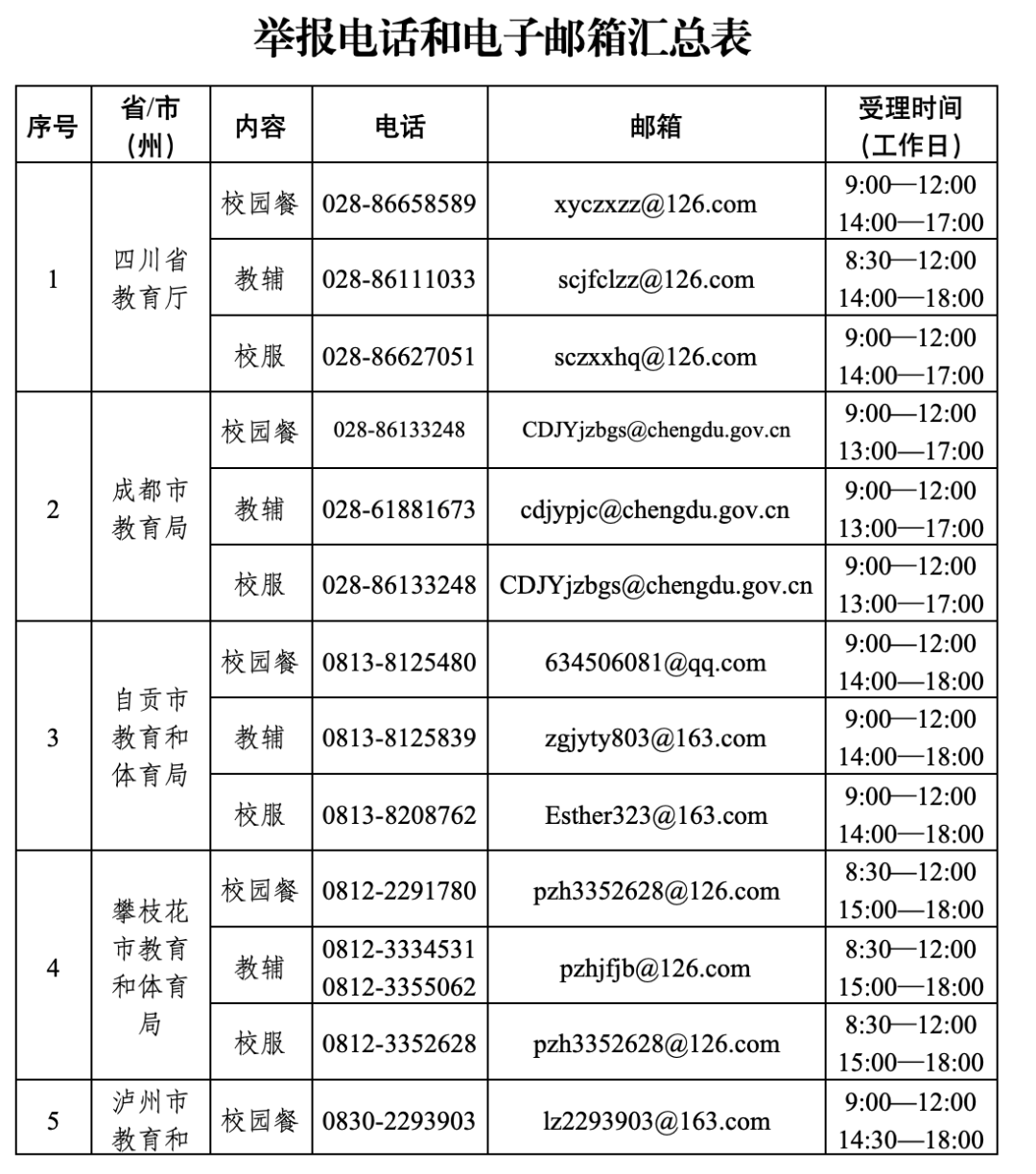 4月14日,四川省教育厅将深化治理全省中小学“校园餐”、利用征订教辅及购买校服谋利等突出问题举报电话和电子邮箱向社会公布。即日起至12月31日,欢迎社会各界反映中小学“校园餐”、利用征订教辅及购买校服谋利方面存在的问题线索和相关证据材料。
